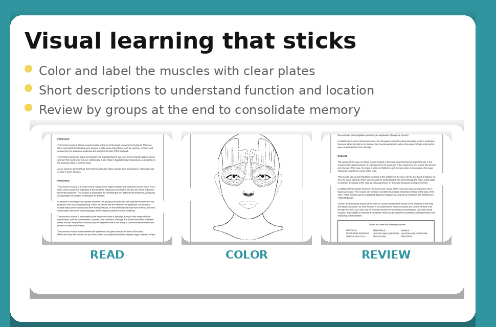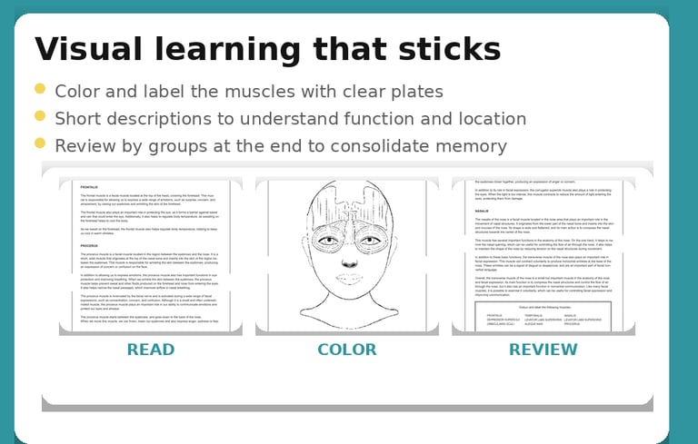 Color, label, and understand the muscles of the face with clear illustrations and short, easy-to-follow descriptions. A practical, visual way to learn—and actually remember.