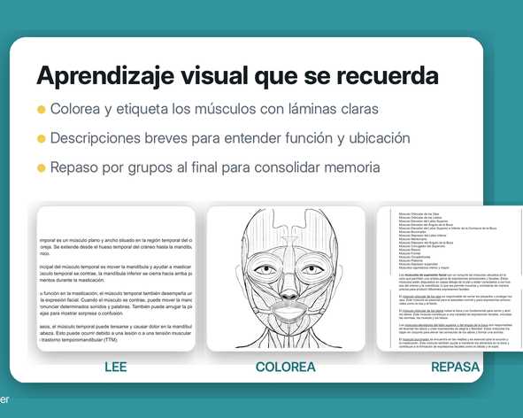 Colorea, etiqueta y comprende los músculos de la cara con ilustraciones claras y descripciones breves y fáciles de seguir. Una forma práctica y visual de aprender y recordar.