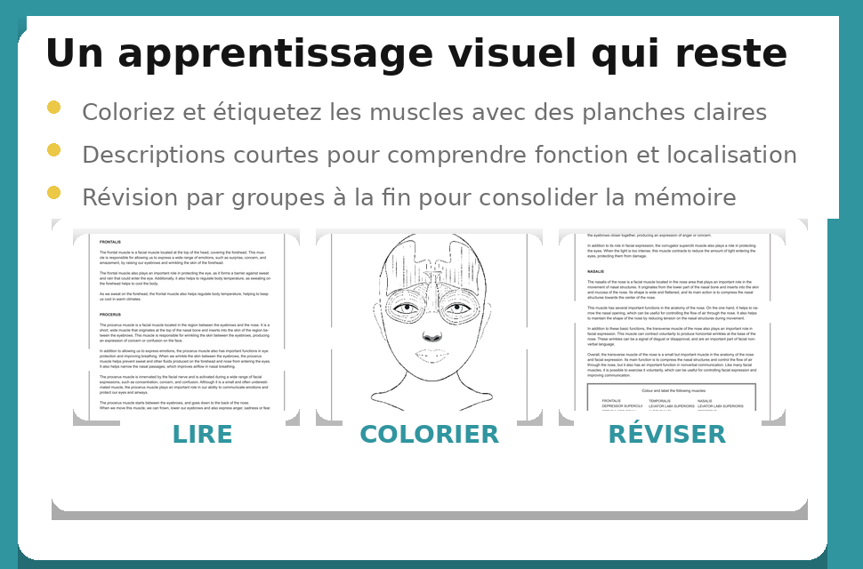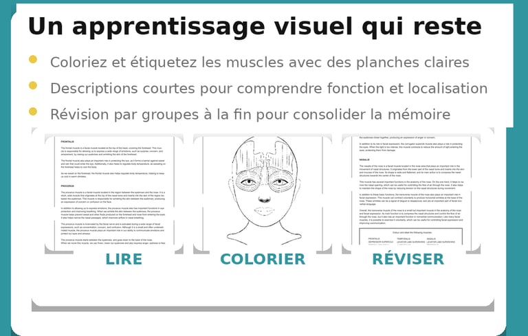 Coloriez, étiquetez et comprenez les muscles du visage grâce à des illustrations claires et à des descriptions courtes, faciles à suivre. Une méthode visuelle, pratique, pour apprendre — et surtout, retenir.